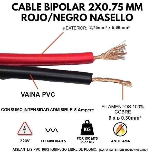CABLE BIPOLAR 2X0.75 MM ROJO/NEGRO AUDIO X 100 MTS CONDUELEC