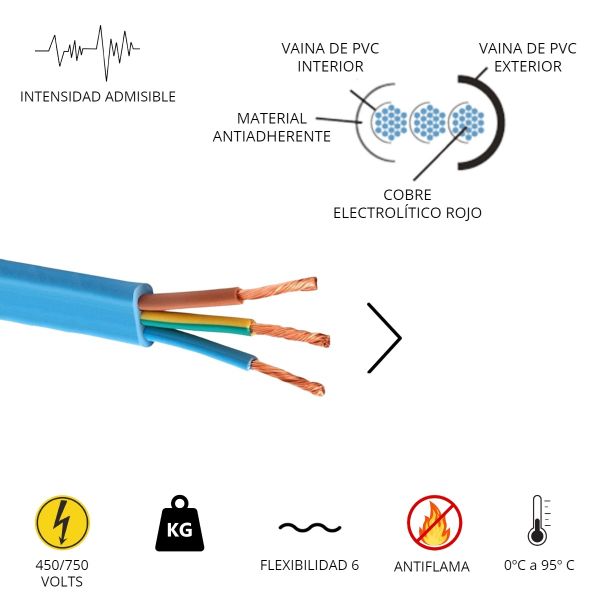 Conductor eléctrico conformado en su interior por cables unipolares miltifilares de cobre electrolíctico rojo, envainados en PVC flexible - antillama, recubiertos por una película de material antiadherente que permite su separación de la vaina extraflexible de PVC resistente a llama exterior. Posee marcación métrica para facilitar su despacho. Se utiliza para conexionado de todo tipo de bombas.