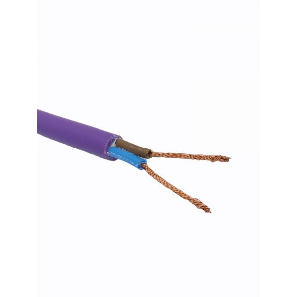 Dos cables unipolares de 2.5mm flexibles, envueltos en una vaina violeta, para instalaciones exteriores o subterráneas de energía e iluminación del inmuebles; civiles e industriales. Cableado de aparatos eléctricos hasta tensiones de 450/750V entre faces