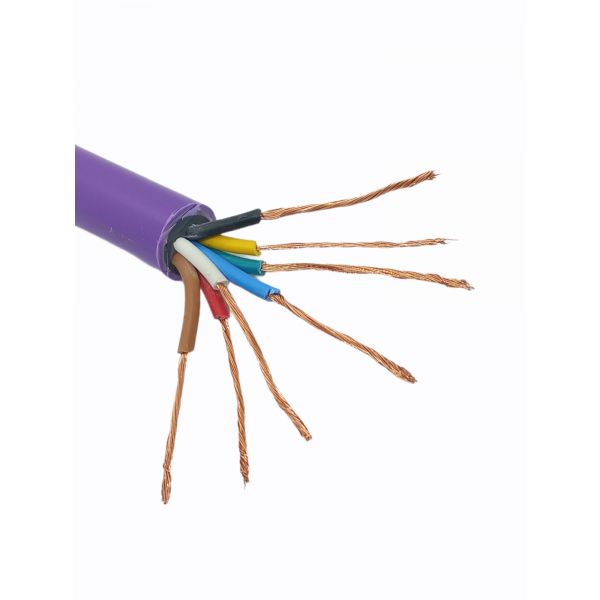 Siete cables unipolares de 1.5mm flexibles, envueltos en una vaina violeta, para instalaciones exteriores o subterráneas de energía e iluminación del inmuebles; civiles e industriales. Cableado de aparatos eléctricos hasta tensiones de 450/750V entre faces