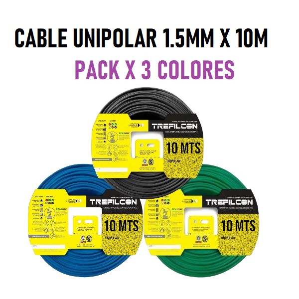 CABLE UNIPOLAR 1.5 MM TREFILCON X 10M PACK X 3 COLORES (NEGRO- CELESTE - VERDE/AMARILLO)