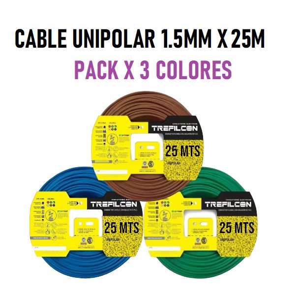 CABLE UNIPOLAR 1.5 MM TREFILCON X 25M PACK X 3 COLORES (MARRON - CELESTE - VERDE/AMARILLO)