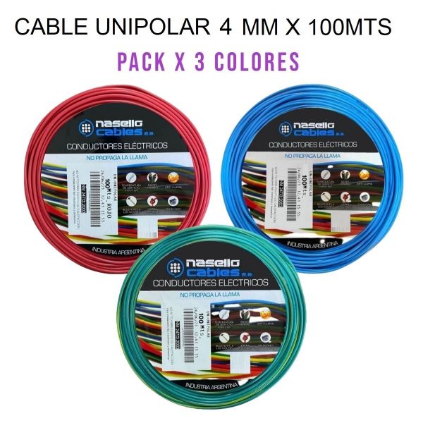 CABLE UNIPOLAR 4 MM X 100M PACK X 3 COLORES (ROJO - CELESTE - VERDE/AMARILLO)