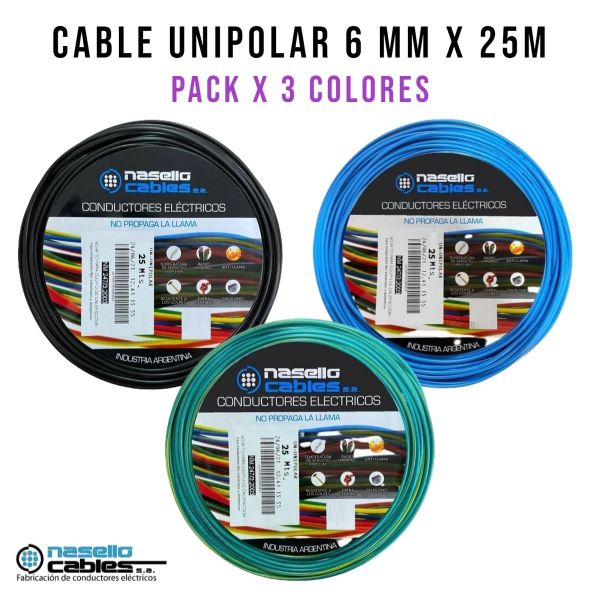 CABLE UNIPOLAR 6 MM X 25M PACK X 3 COLORES (NEGRO - CELESTE - VERDE/AMARILLO)