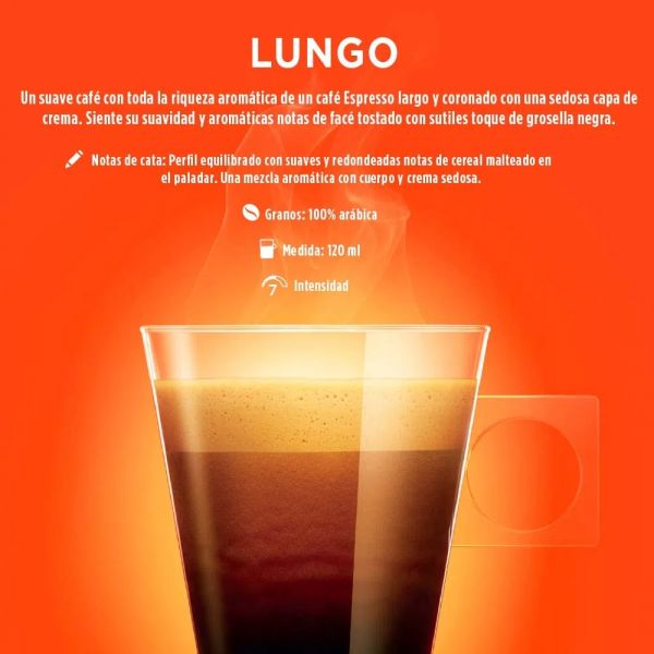 La caja contiene 16 cápsulas diseñadas para máquinas NESCAFÉ® Dolce Gusto® para preparar 16 tazas de Lungo.