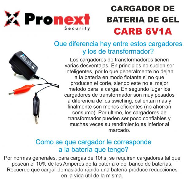 CARGADOR DE BATERIA DE GEL 6V 1 AMP C/ CORTE AUTOMATICO PRONEXT