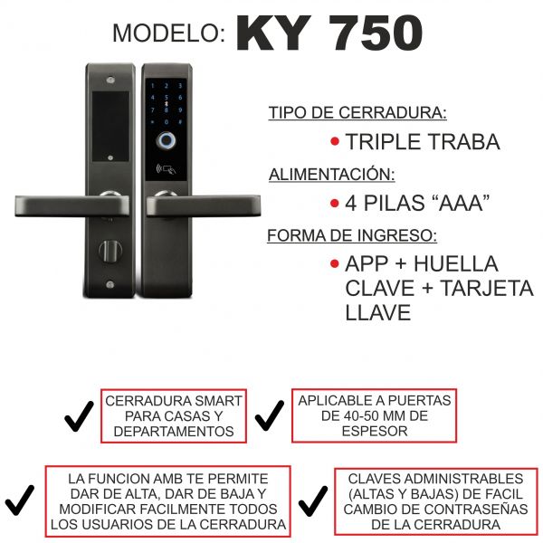 CERRADURA SMART DE TRIPLE TRABA HUELLA APP + CLAVE + TARJETA + LLAVE MECÁNICA PRONEXT