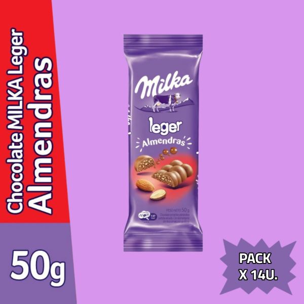 CHOCOLATE MILKA LEGER ALMENDRAS 50 GR X 14 UNIDADES