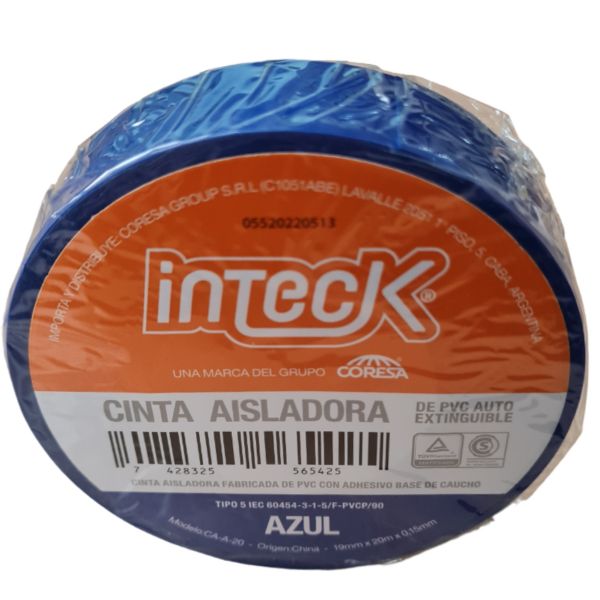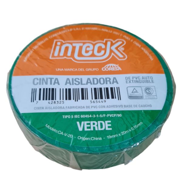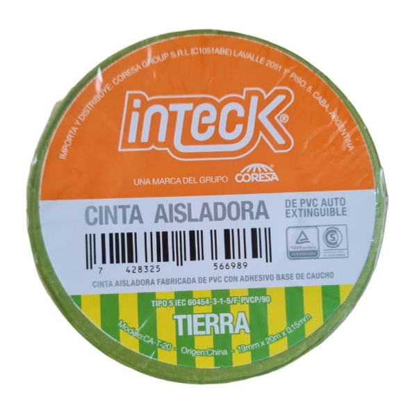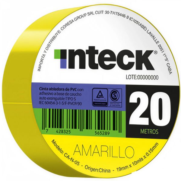 Cinta Aisladora de PVC Inteck 20 mts Aplicaciones: Aislaciones internas y externas de hasta 600V. · Protección externa en instalaciones de madia y alta tensión. · Identificación de cables (colores) - Armado de mazos de cables. · Enmascarar superficies y protegerlas da la abrasión, rayos UV, corrosión, humedad, etc. Colores: Blanco, Negro, Rojo, Amarillo, Verde, Azul y Tierra.