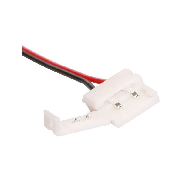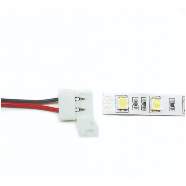 Para Tira Led de 50mm x 50 mm. El rojo es el positivo y el negro negativo. Este conector sirve para poderlo unir a una fuente de alimentacion de 12V; luego la fuente irá a 220V. Disfrutalo