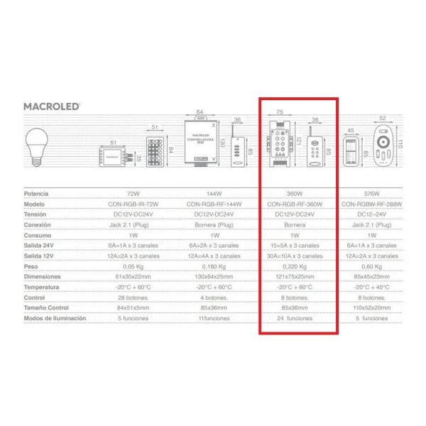 Controladora RGB 360W, control con 24 modos de iluminación.