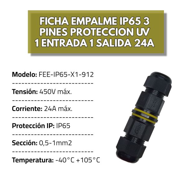 FICHA EMPALME IP65 3 PINES PROTECCION UV 1 ENTRADA 1 SALIDA 24A INTEK