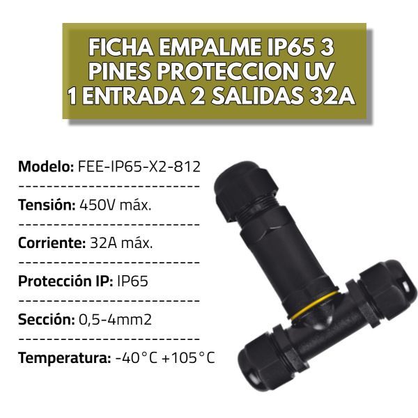 FICHA EMPALME IP65 3 PINES PROTECCION UV 1 ENTRADA 2 SALIDAS 32A INTEK