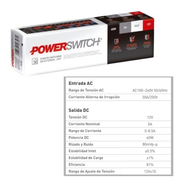 FUENTE LED SWITCHING 12V 5A 60W IP67 POWER SWITCH