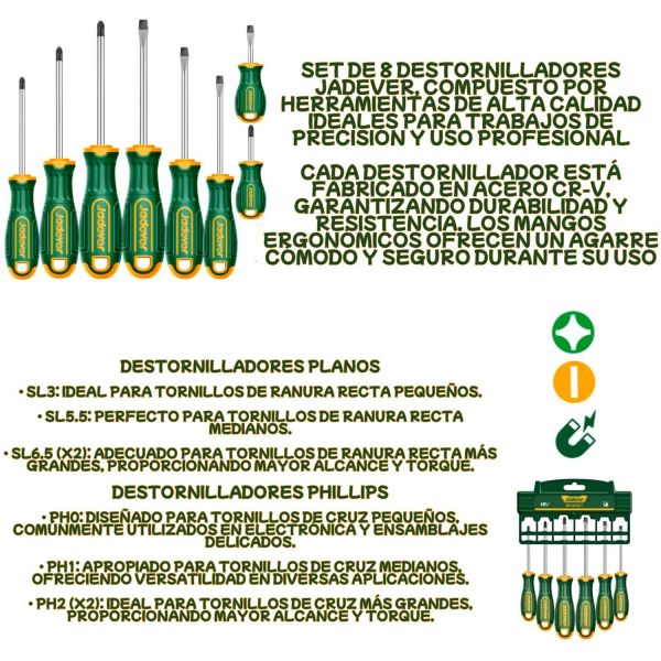 KIT DE DESTORNILLADORES IMANTADOS PLANOS Y PHILLIPS - 8 PIEZAS - ACERO CR-V JADEVER
