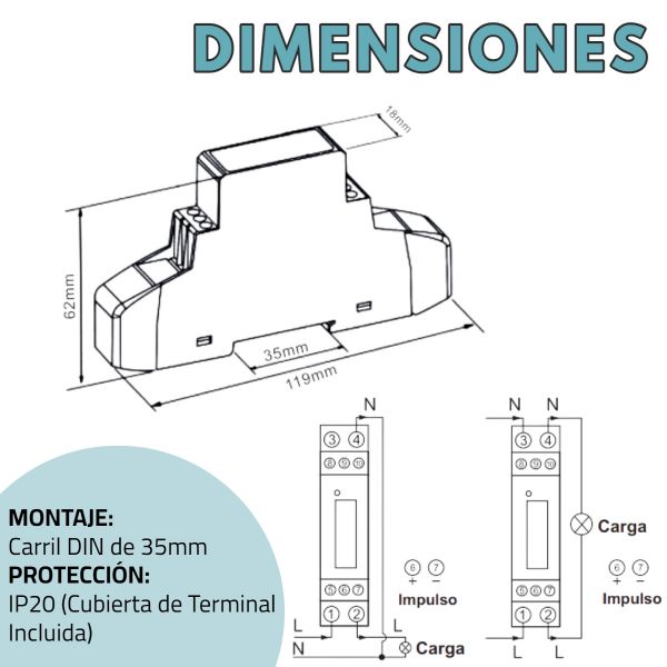 - Pantalla LCD: 5 + 2 digitos (99999.99 kWh)