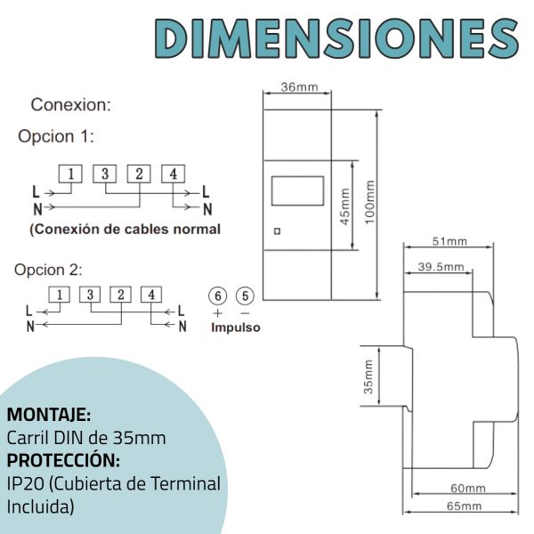 - Pantalla LCD: 5 + 1 digitos (99999.99 kWh)