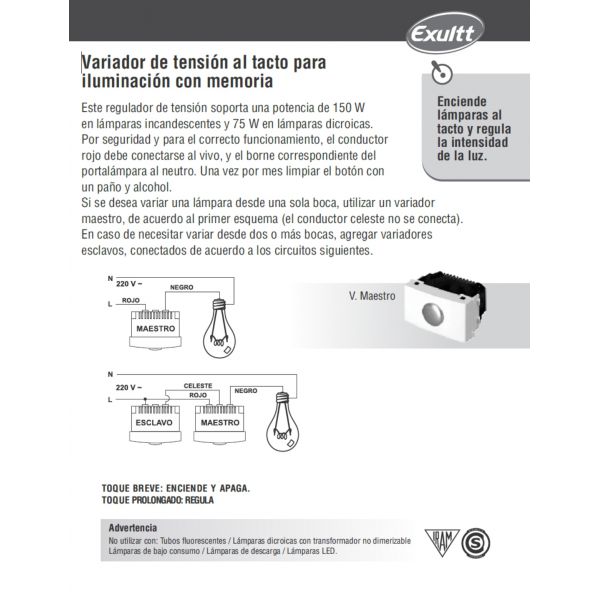 MODULO VARIADOR AL TACTO (MAESTRO) INCANDECENTES 150 W HALOGENA 75W LINEA URBANA EXULTT