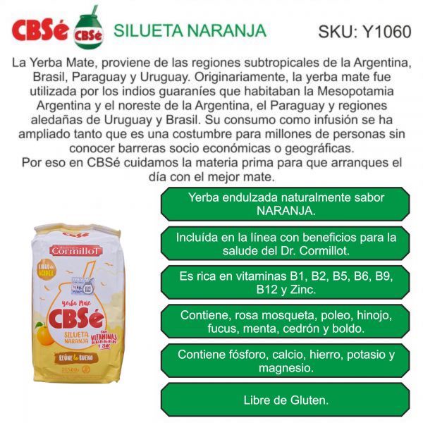 Si querés darte el gusto de una deliciosa mezcla de yerba mate con rosa mosqueta, poleo, hinojo, fucus, menta, cedrón y boldo, sólo tenés que probar CBSé Silueta Naranja. Adicionada con vitaminas B1, B2, B5, B6, B9, B12 y Zinc. Es la primera yerba mate con prebióticos del mercado-, Silueta Naranja integra la familia de Alimentos Dr. A. Cormillot, que aportan beneficios a la salud y promueven el bienestar.