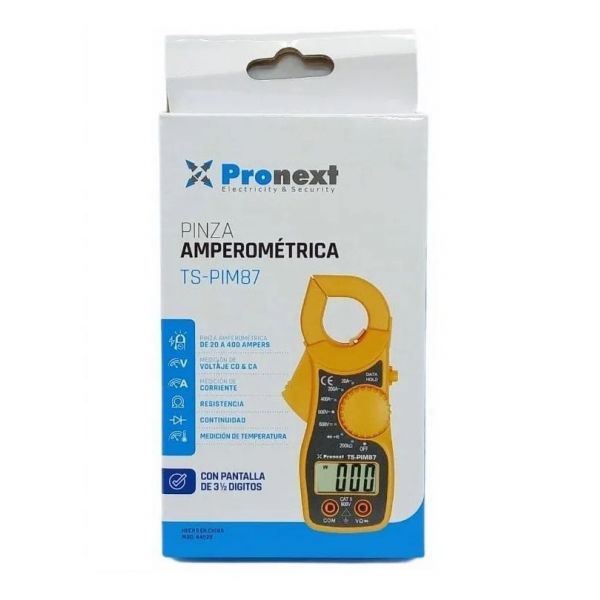 • caracteristicasPinza Amperométrica de hasta 400Amperes - Voltaje Continua: 600V - Voltaje Alterna: 600V - Corriente AC: 20A, 200A, 400A - Resistencia: 200K - Almacenamiento de datos - Diodo y continuidad audible