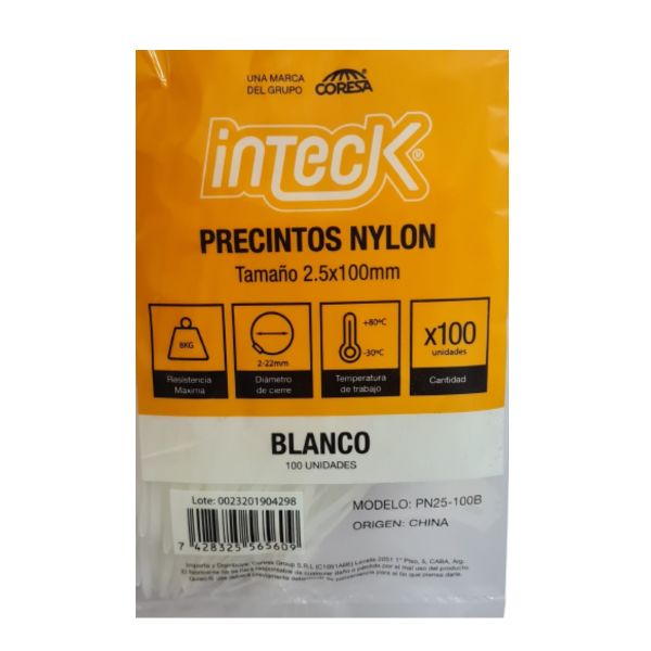 PRECINTO DE NYLON 2.5MM X100MM - BLANCO X 100 UNIDADES INTECK