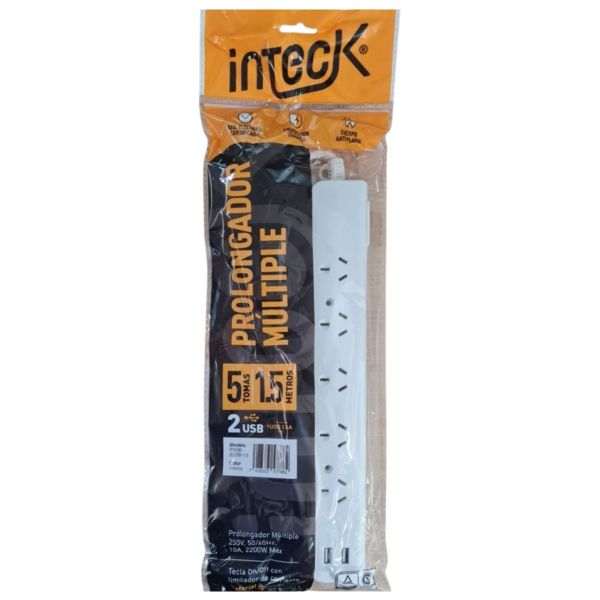 PROLONGADOR MULTIPLE 5 TOMAS + 2 USB BLANCO CON CABLE 1.5 MTS C/ PROTECTOR TERMICO