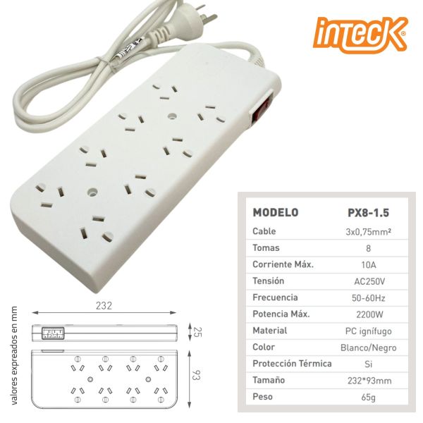 PROLONGADOR MULTIPLE 8 TOMAS BLANCO 1,5 MTS DE CABLE 3X0,75MM C/ PROTECTOR TERMICO