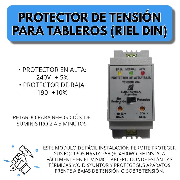 ESTE MODULO DE FÁCIL INSTALACIÓN PERMITE PROTEGER SUS EQUIPOS HASTA 20A (+- 4500W ). SE INSTALA FÁCILMENTE EN EL MISMO TABLERO DONDE ESTÁN LAS TÉRMICAS Y/O DISYUNTOR Y PROTEGE SUS APARATOS FRENTE A BAJAS DE TENSIÓN O SOBRE TENSIÓN.
