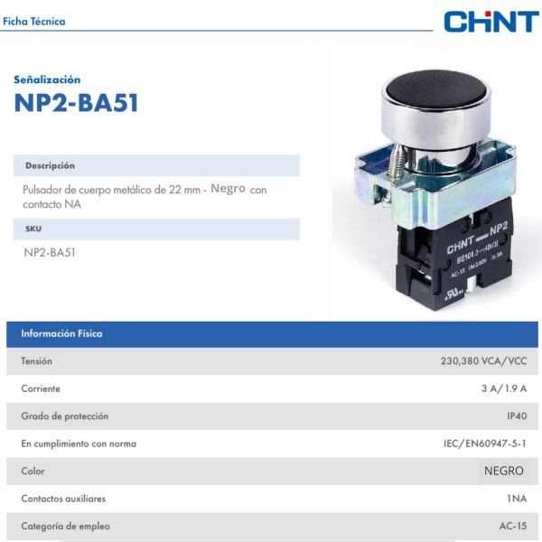 PULSADOR DE CUERPO METALICO DE 22 MM NEGRO CON CONTACTO NA