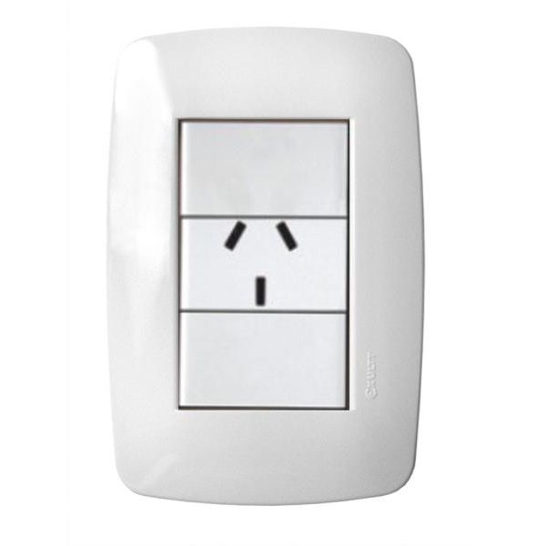 Tapa blanca rectangular + Bastidor de 3 módulos + 1 Tomacorriente con toma de tierra + 2 Módulos ciego.