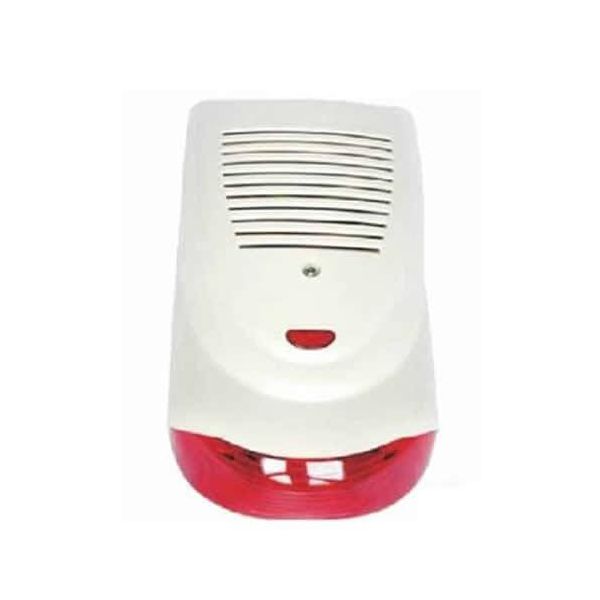 Sirena de exterior potente con carcaza plastica, refuerzo interior metálico y luz stroboscopica.