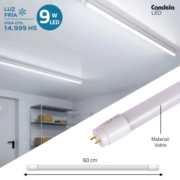 TUBO LED T8 VIDRIO 9W FRIO 60 CM CANDELA
